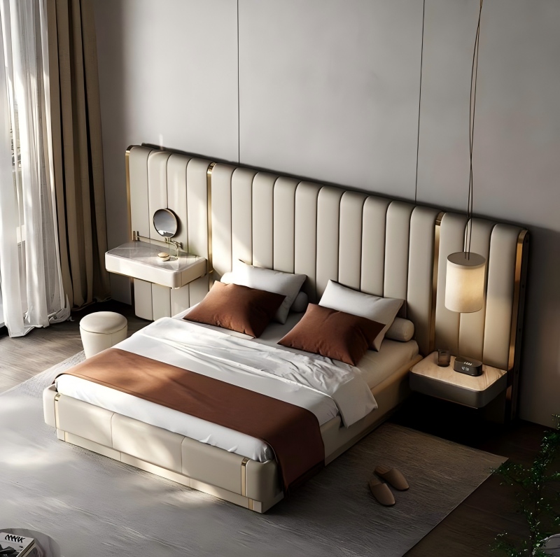 [Estilo ng Kilalang Tao] Italian minimalist na katad na kama + rock board bedside table | set ng silid -tulugan