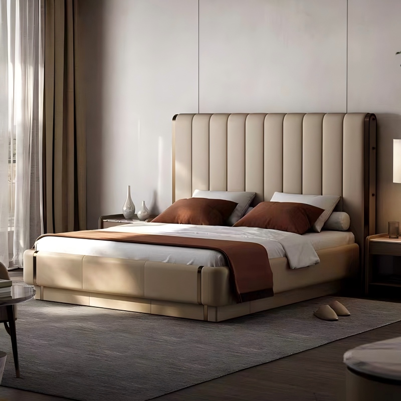 Light Luxury Master Bedroom Three-Piece Set "1.8m Balat na Bed + Double Bedside Tables | Nangungunang Layer Cowhide, Lumulutang na Disenyo