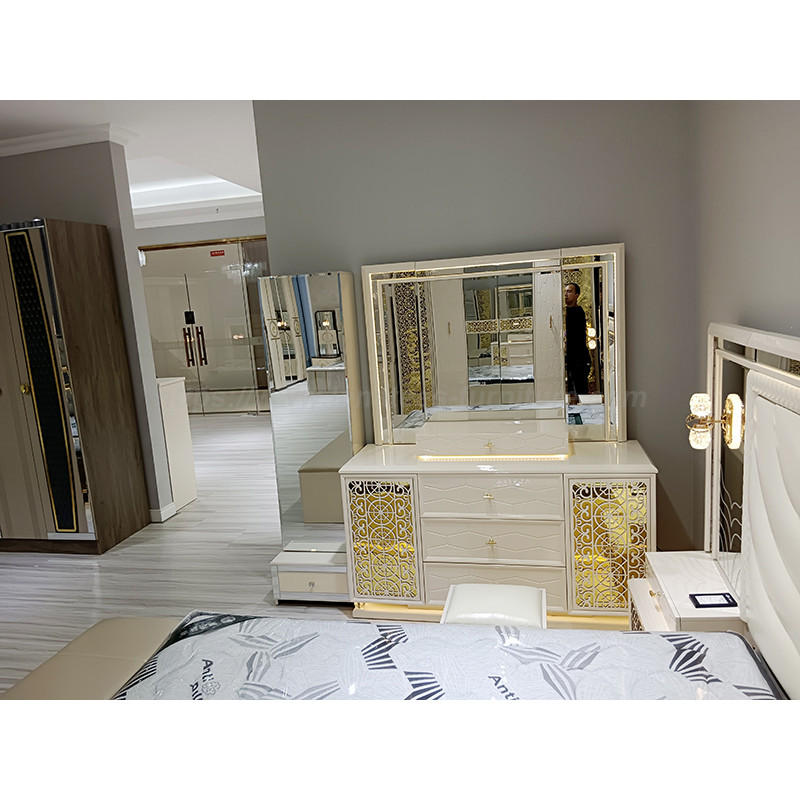 Nahihirapan ka bang pumili ng isang piraso ng kasangkapan at iba't ibang mga kumbinasyon? Ang nasabing hanay ng mga kasangkapan sa bahay ay malulutas ang iyong mga problema. Ang istraktura ng kama simpleng fashion, gamit ang gintong hindi kinakalawang na asero na mga elemento, mas sunod sa moda. Ang mga elemento ng marmol at metal, simple at maluho, hayaang lumiwanag ang mga mata. Maaari mong matiyak na bumili ng modernong disenyo ng silid-tulugan na hotel na itinakda mula sa aming pabrika at mag-aalok kami sa iyo ng pinakamahusay na serbisyo pagkatapos ng pagbebenta at napapanahong paghahatid.