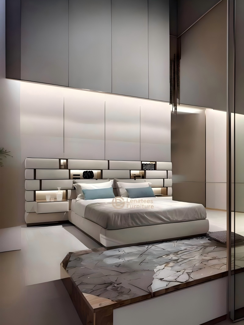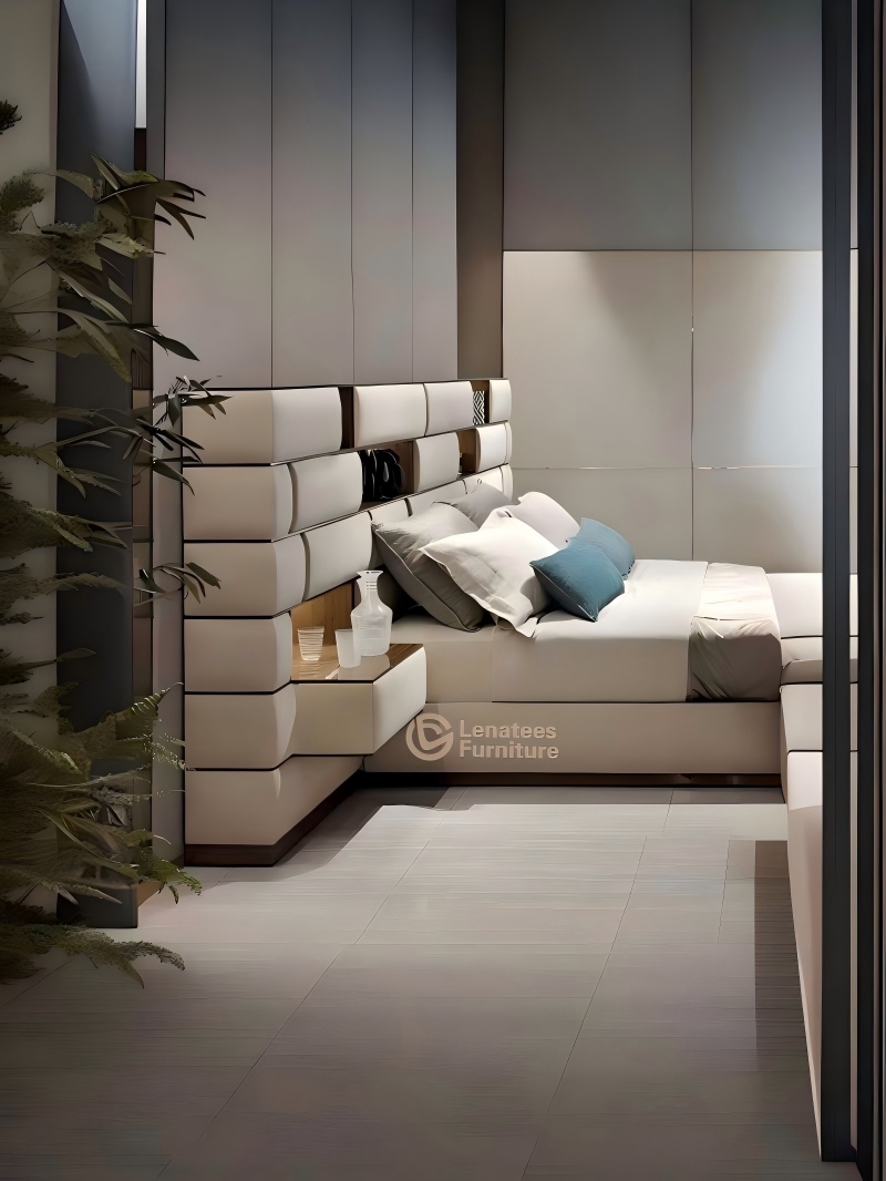 Nagtatampok ang luho na kama na ito ng isang naka -bold na headboard na may pino na mga accent ng metal - timpla ng ginhawa, pagkakayari, at kontemporaryong disenyo.